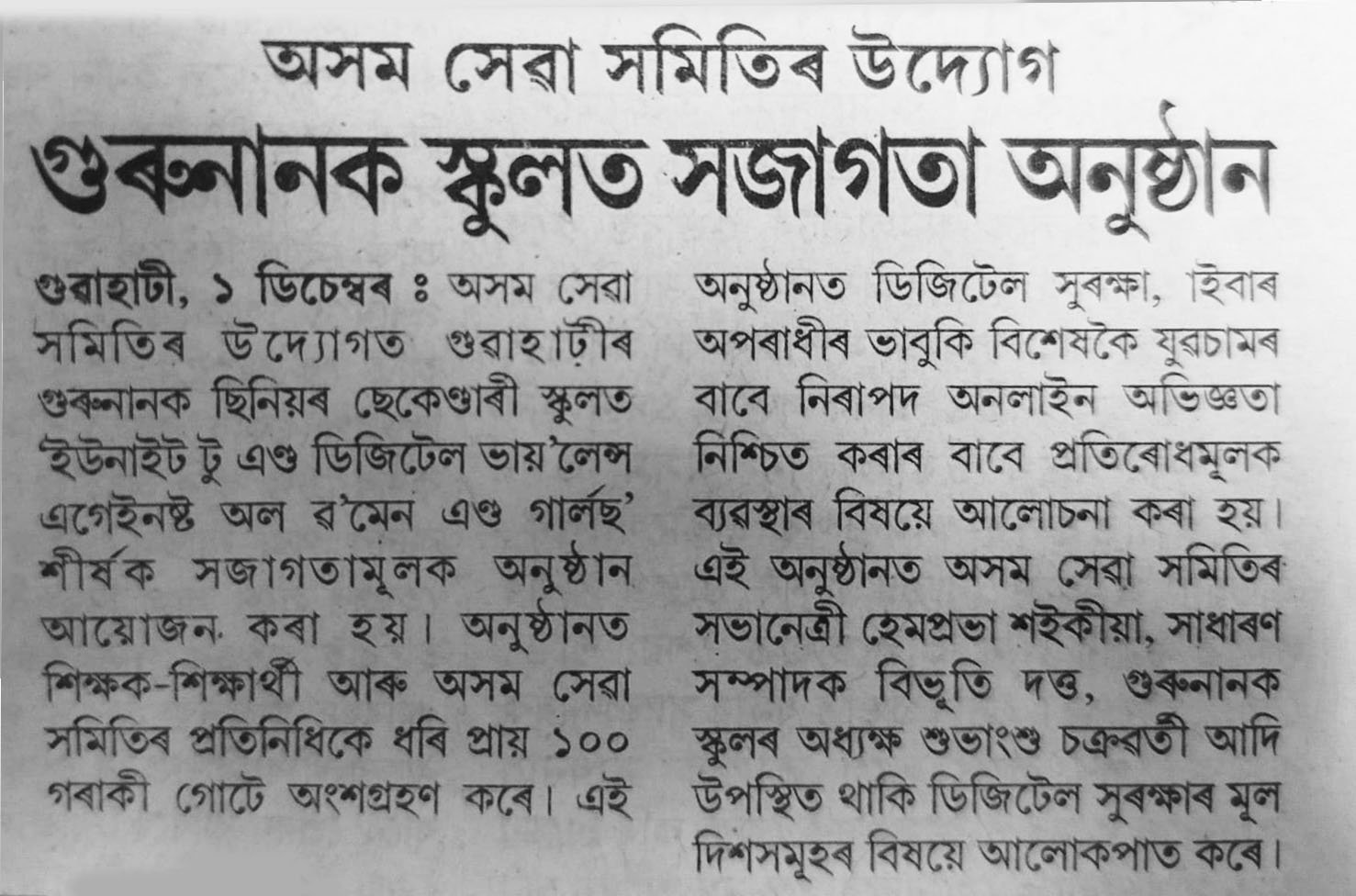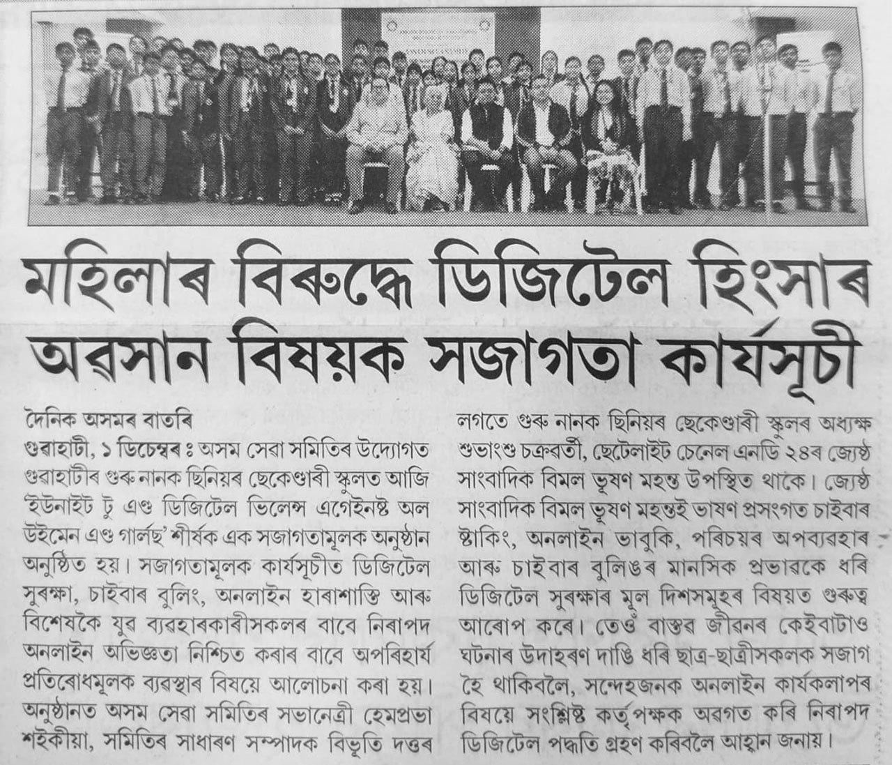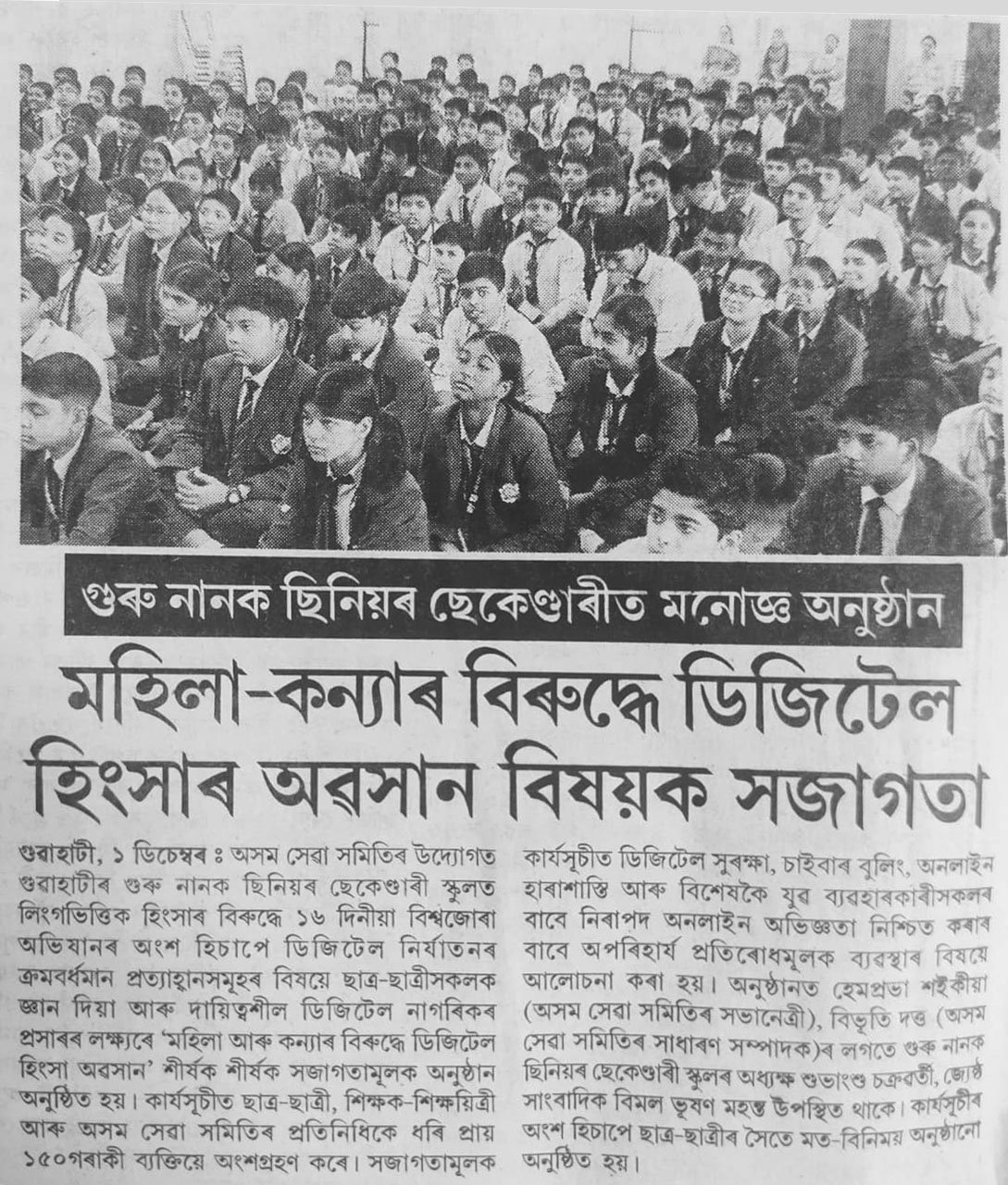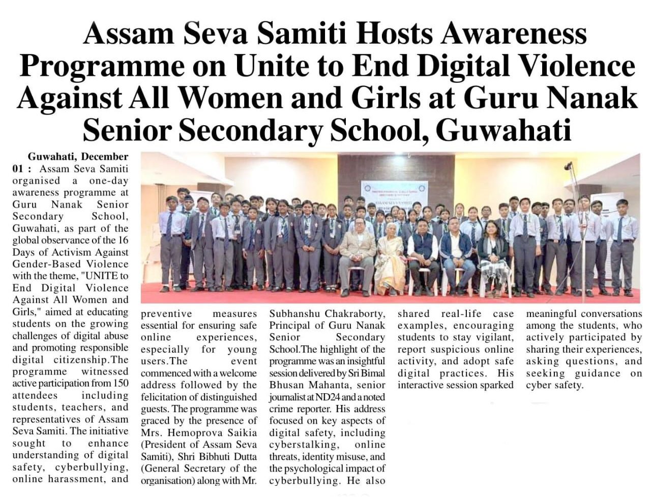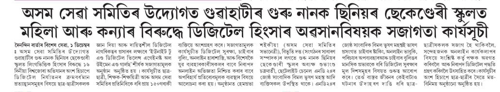 News published in multiple newspapers on December 1, 2025, highlighted the successful initiative by “Assam Seva Samiti,” which conducted an awareness program on the theme “UNITE to End Digital Violence Against All Women and Girls.” Organized under the global campaign 16 Days of Activism Against Gender-Based Violence, the event took place at Guru Nanak Senior Secondary School, Guwahati.