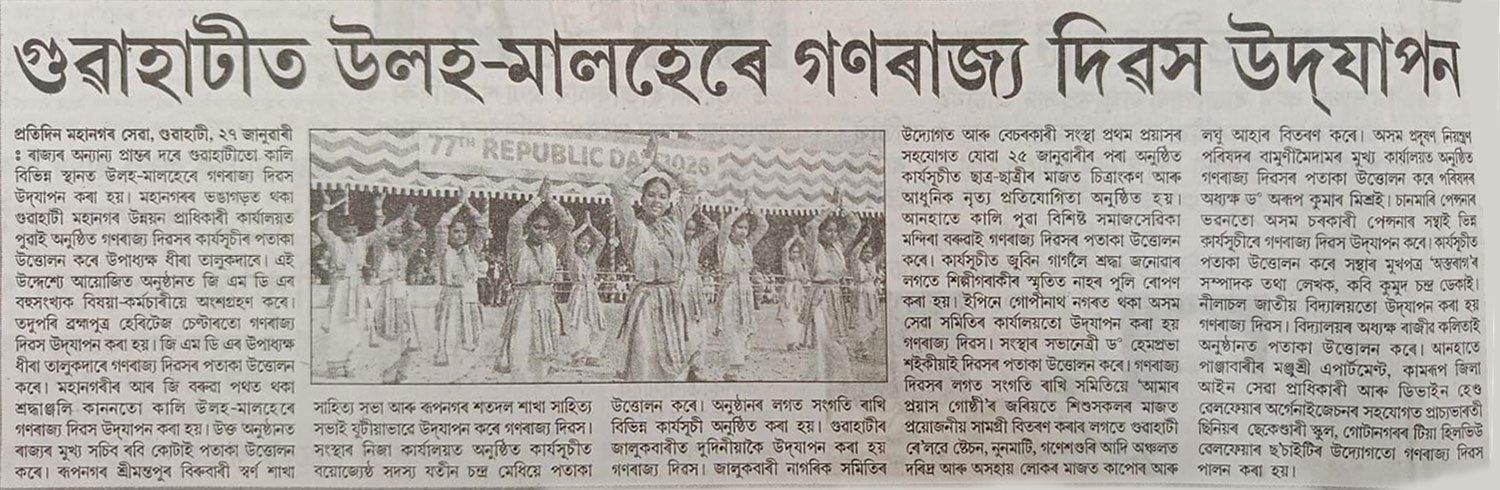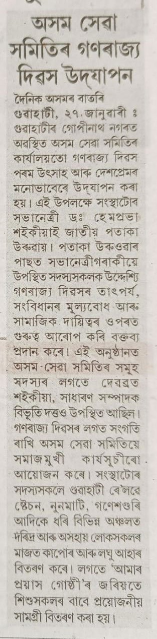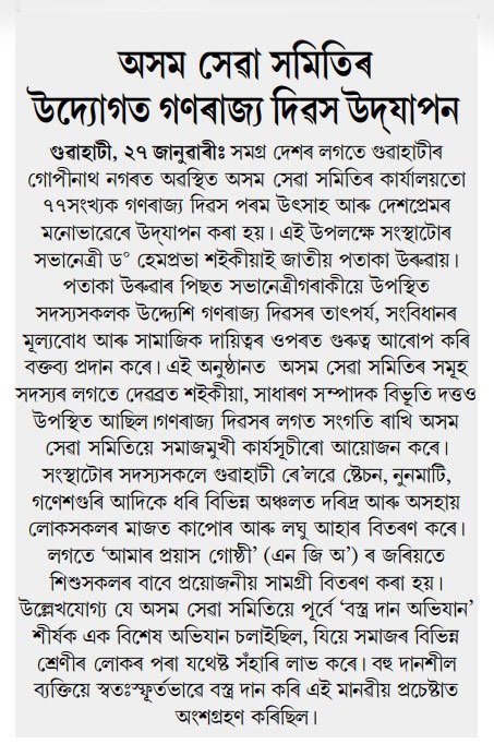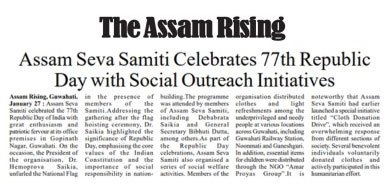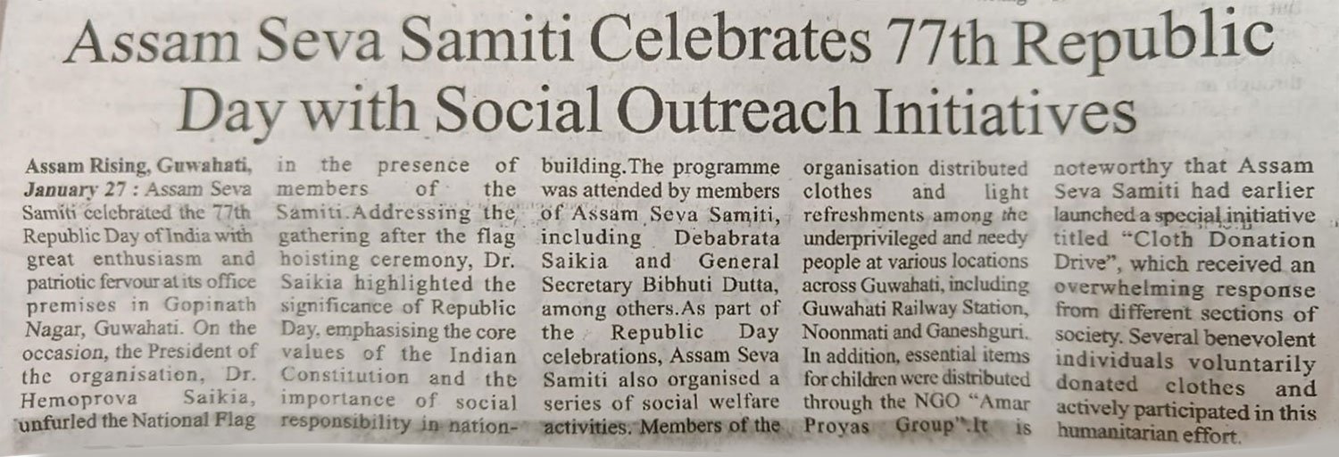 Assam Seva Samiti marked the 77th Republic Day with a series of meaningful social outreach initiatives, reaffirming its commitment to service and nation-building. The celebrations went beyond ceremonial observances, focusing on community welfare activities such as cloth distribution drives and support for vulnerable sections of society.