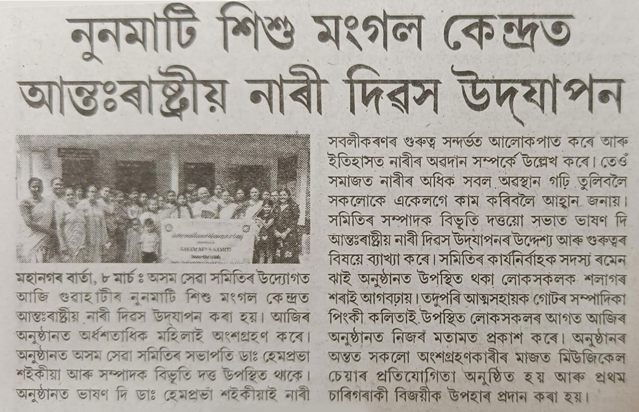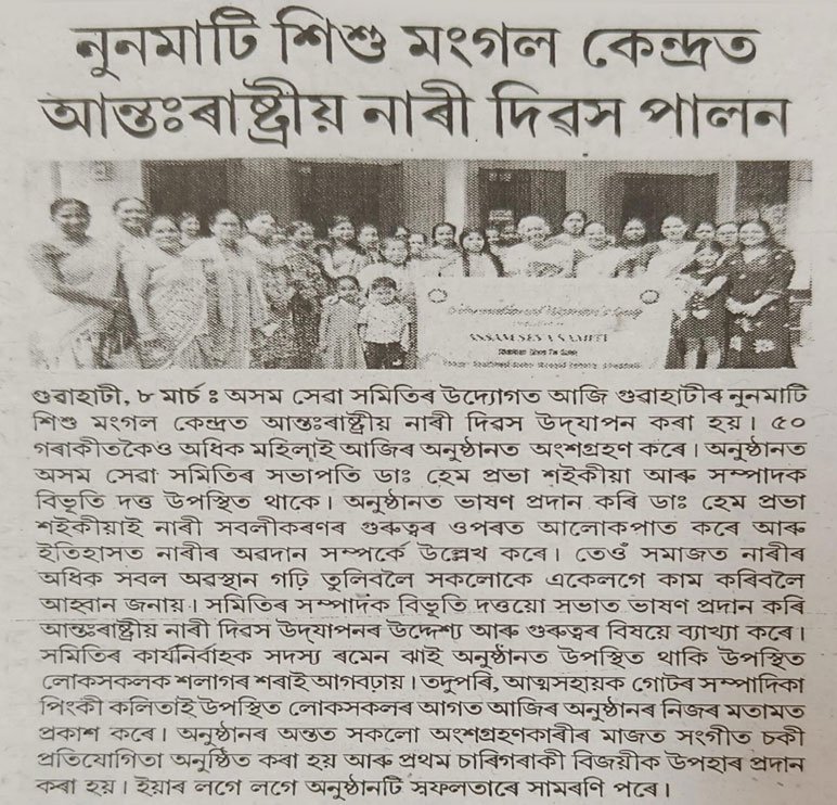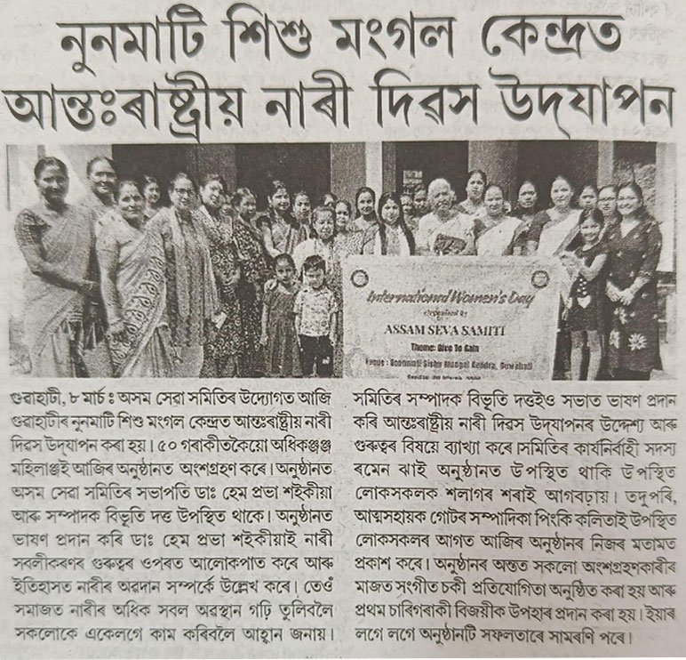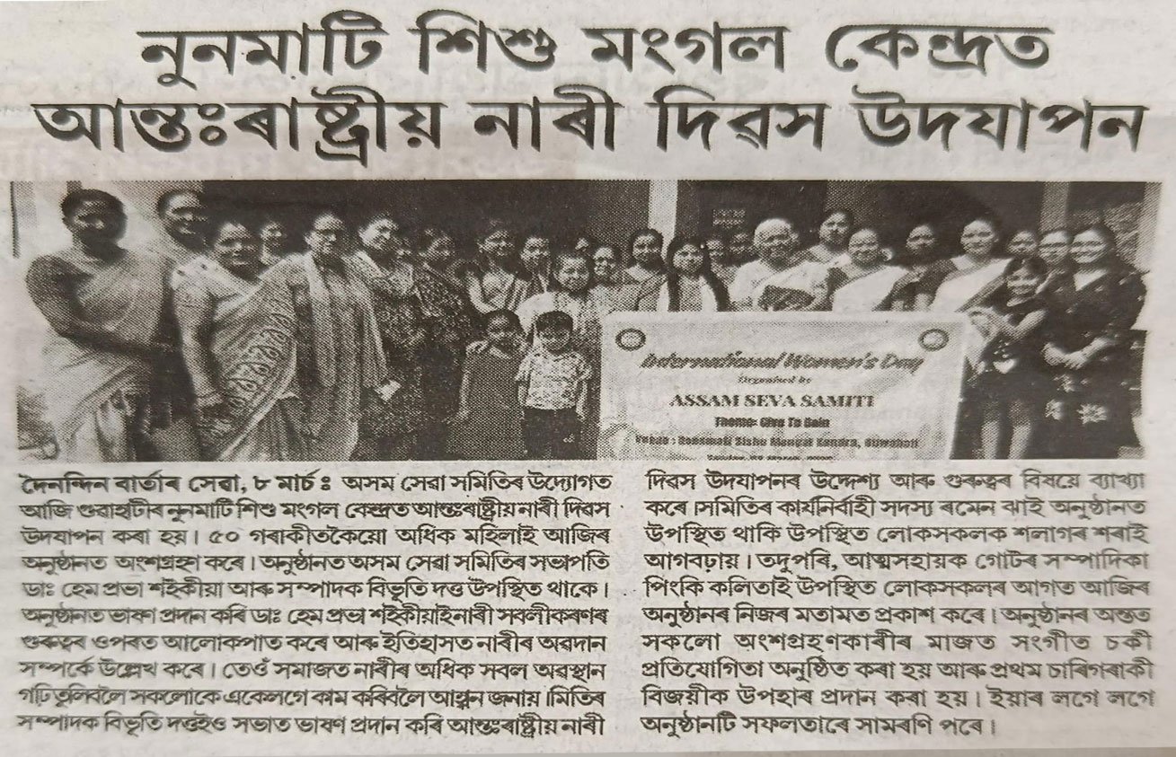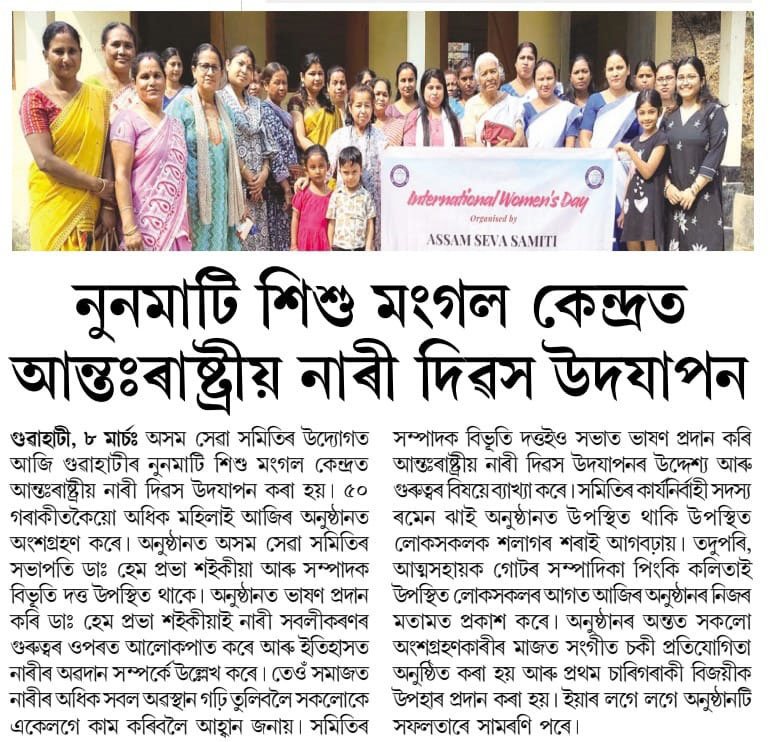 The International Women’s Day celebration organised by Assam Seva Samiti at Noonmati Sishu Mangal Kendra, Guwahati, has been widely covered by leading regional newspapers. The event, held under the theme “Give to Gain,” saw enthusiastic participation from women and community members. Speakers highlighted women’s empowerment, social contribution, and the importance of unity in building a progressive society. The extensive media coverage reflects the significance of the initiative and its impact in promoting awareness and empowerment at the grassroots level.